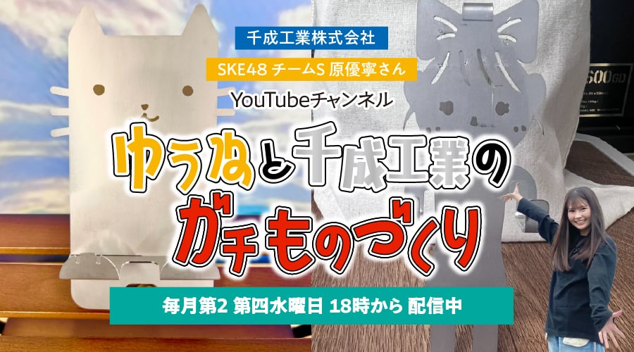 SKE48原 優寧さんと千成工業のコラボ商品第一弾はスマホスタンドです! 愛らしい猫ちゃんをデザインしていただきました。 ポイントは表情にこだわったお顔としっぽのリボン。 背面には番組名を刻印してお届けします。